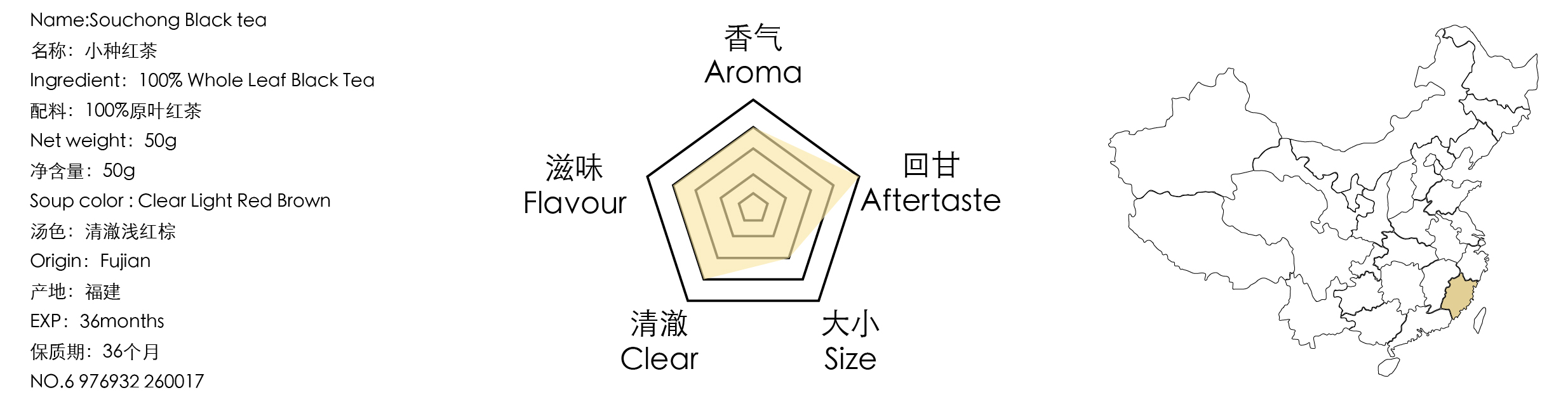 The so-called "small species" refer to small-leaf tea trees, and the production area and output are limited by the regional microclimate. Souchong black tea is a fully fermented tea. During the fermentation process, the enzymes in the tea leaves fully react with tea polyphenols, pectin and other substances, and are converted into the aflavins, the arubigins and other substances. Generally, the taste becomes even better and mellow after 1-2 years of storage. This tea is made by using smokeless techniques. The dry tea is dark and shimmering in color, which has a long aroma refreshing and sweet taste.